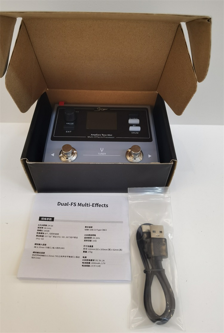 Convertidor A/D/A de 24 bits + SNR de 100 dB <\/strong>: ofrece un tono nítido y sin ruido que rivaliza con las marcas de alta gama, lo que le permite establecer un precio minorista competitivo con márgenes de beneficio saludables.<\/p><\/li> 100 ajustes preestablecidos en total (50 de fábrica + 50 personalizables por el usuario) <\/strong>: cubre todos los géneros populares: rock, blues, metal, jazz, country y más. La facilidad de uso inmediata lo hace perfecto para principiantes, mientras que las opciones de edición avanzadas satisfacen a los jugadores experimentados.<\/p><\/li> 8 módulos de efectos que se ejecutan simultáneamente <\/strong>: incluye simulaciones de amplificador, distorsiones, retrasos, reverberaciones, modulaciones y ecualizadores. Un pedal reemplaza más de 8 pedales individuales, lo que reduce el costo de sus clientes y el número de SKU de su inventario.<\/p><\/li><\/ul> Batería de litio incorporada de 2000 mAh y 3,7 V <\/strong>: proporciona un mínimo de 7 horas de reproducción continua, eliminando la necesidad de fuentes de alimentación voluminosas en conciertos al aire libre, ensayos o actuaciones callejeras.<\/p><\/li> Compatibilidad con alimentación dual <\/strong>: funciona con USB-C (5 V/12 V, 500 mA) o con batería, lo que ofrece máxima flexibilidad para cualquier entorno de juego.<\/p><\/li> Diseño compacto y liviano <\/strong>: 193,5 × 125 × 56,5 mm, 454 g. Cabe fácilmente en cualquier estuche de guitarra o pedalera, lo que lo hace ideal para músicos que viajan<\/p><\/li><\/ul> Interfaz USB 2.0 tipo C integrada <\/strong>: permite la grabación directa en computadoras, portátiles o dispositivos móviles con calidad de audio de 44,1 kHz/16 bits<\/p><\/li> No se requieren controladores adicionales <\/strong>: funciona perfectamente con todos los principales DAW (Ableton, Logic Pro, Pro Tools, GarageBand), lo que lo convierte en la mejor opción para estudiantes y entusiastas de la grabación en casa.<\/p><\/li> Salida de auriculares dedicada <\/strong>: conector estéreo TRS de 1/4\' para práctica silenciosa, una característica imprescindible para quienes viven en apartamentos y tocan trasnochadores<\/p><\/li><\/ul> Chasis de metal resistente <\/strong>: construido para soportar los rigores de las actuaciones en vivo y el transporte frecuente.<\/p><\/li> Conectores e interruptores de alta calidad <\/strong>: garantiza una conectividad confiable y años de uso sin problemas, lo que reduce los reclamos de garantía y las devoluciones de los clientes.<\/p><\/li> Entrada/salida estándar de 1/4\' <\/strong>: Compatible con todas las guitarras eléctricas, bajos, amplificadores y pedaleras, no se necesitan adaptadores<\/p><\/li><\/ul> Categoría de parámetro<\/strong><\/p><\/th> Elemento de parámetro<\/strong><\/p><\/th> Detalles<\/strong><\/p><\/th><\/tr> Información básica<\/strong><\/p><\/td> Nombre del producto<\/p><\/td> Pedal de guitarra multiefectos<\/p><\/td><\/tr> <\/p><\/td> Número de artículo.<\/p><\/td> Tono AmpCore<\/p><\/td><\/tr> Rendimiento de audio principal<\/strong><\/p><\/td> Convertidor A/D/A<\/p><\/td> 24 bits<\/p><\/td><\/tr> <\/p><\/td> Frecuencia de muestreo admitida<\/p><\/td> 44,1 kHz<\/p><\/td><\/tr> <\/p><\/td> SNR (relación señal-ruido)<\/p><\/td> 100dB<\/p><\/td><\/tr> <\/p><\/td> Módulos de efectos simultáneos<\/p><\/td> 8 módulos<\/p><\/td><\/tr> <\/p><\/td> Especificación de grabación USB<\/p><\/td> Frecuencia de muestreo de 44,1 kHz, profundidad de bits de 16 bits<\/p><\/td><\/tr> Especificaciones de la interfaz<\/strong><\/p><\/td> Entrada analógica<\/p><\/td> Conector mono TS de 1/4\", impedancia de entrada de 1 MΩ<\/p><\/td><\/tr> <\/p><\/td> Salida analógica/auriculares<\/p><\/td> Conector estéreo no balanceado TRS de 1/4\", impedancia de salida de 100 Ω<\/p><\/td><\/tr> <\/p><\/td> Puerto digital<\/p><\/td> Puerto USB 2.0 tipo C<\/p><\/td><\/tr> Almacenamiento preestablecido<\/strong><\/p><\/td> Preajustes de fábrica<\/p><\/td> 50 (F01~F50)<\/p><\/td><\/tr> <\/p><\/td> Preajustes de usuario<\/p><\/td> 50 (P01~P50)<\/p><\/td><\/tr> Dimensiones y peso<\/strong><\/p><\/td> Tamaño del producto<\/p><\/td> 193,5 mm (ancho) × 125 mm (profundidad) × 56,5 mm (alto)<\/p><\/td><\/tr> <\/p><\/td> Peso unitario<\/p><\/td> 454g<\/p><\/td><\/tr> Especificaciones de energía<\/strong><\/p><\/td> Requisito de alimentación USB<\/p><\/td> CC 5 V/12 V, 500 mA<\/p><\/td><\/tr> <\/p><\/td> Batería incorporada<\/p><\/td> Batería de litio de 2000 mAh y 3,7 V.<\/p><\/td><\/tr> <\/p><\/td> Duración de la batería<\/p><\/td> Mínimo 7 horas<\/p><\/td><\/tr><\/tbody><\/table><\/div> MOQ flexible <\/strong>: cantidades mínimas de pedido bajas para ayudarle a probar el mercado y reducir el riesgo de inventario<\/p><\/li> Personalización OEM/ODM <\/strong>: agregue el logotipo de su marca, personalice el empaque o modifique los ajustes preestablecidos para crear productos exclusivos para su tienda.<\/p><\/li> Envío global rápido <\/strong>: socios logísticos confiables con tarifas competitivas a América del Norte, Europa, Asia y todo el mundo.<\/p><\/li> Garantía de calidad <\/strong>: 100 % de inspección del producto antes del envío, con 1 año de garantía del fabricante<\/p><\/li> Soporte dedicado <\/strong>: equipo de ventas profesional con profundo conocimiento de instrumentos musicales para ayudarlo con preguntas sobre productos y servicio posventa.<\/p><\/li> Cadena de suministro estable <\/strong>: gran capacidad de producción para garantizar una disponibilidad constante de existencias para su negocio en crecimiento.<\/p><\/li><\/ul> P: ¿Cuál es la cantidad mínima de pedido?<\/strong><\/p> R: Nuestra cantidad mínima de pedido estándar es de 10 unidades. Para pedidos de logotipos personalizados, la cantidad mínima de pedido es de 50 unidades.<\/p> P: ¿Puedo mezclar diferentes productos en un solo pedido?<\/strong><\/p> R: Sí, ofrecemos opciones de pedidos mixtos para todos nuestros