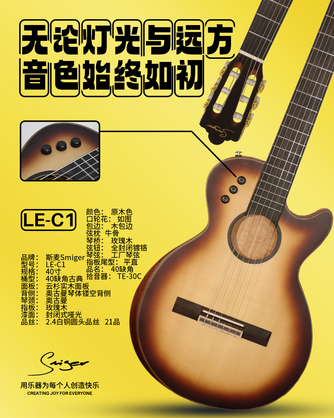 Smiger LE-C1 Guitarra electroacústica de nailon transfronteriza de alta gama - Guitarra clásica recortada de 40 pulgadas